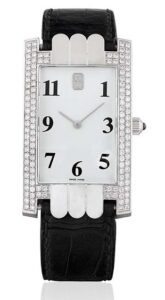 This 18K white gold Avenue wristwatch from around 2000 combines jewellery craftsmanship with horological design. It features a quartz movement, ensuring precision and low maintenance.