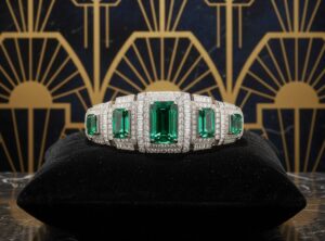 Art Deco bracelets, from the 1920s to the 1950s, marked a bold departure from tradition. Influenced by modernity, machinery, and global cultures, designs featured sharp geometric patterns, contrasting colours, and innovative settings.