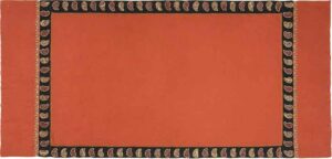 This vibrant Paisley wool shawl features an orange central field decorated on all four sides with intricate paisley and floral embroidery. The colour palette includes shades of red, cream, orange, blue, and black, creating a lively yet harmonious effect.