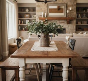 The dining table is the soul of a farmhouse home. Choose a large, solid-wood table — ideally with a natural or distressed finish. A plank-style or trestle table works beautifully.