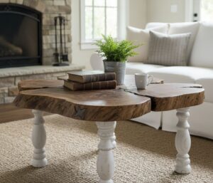 Imagine walking into a room that instantly transports you to a charming countryside house. A beautiful wooden sofa with soft cotton upholstery sits by the window, paired with a unique rustic coffee table and lush indoor plants that fill the space with warmth and life.