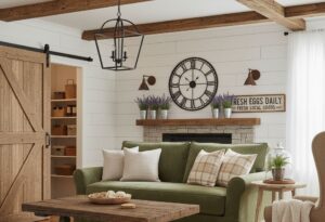 Barn doors, shiplap walls, metal wall clocks, or vintage signs — these finishing touches pull the look together. The key is not to overdo it; a few statement pieces go a long way.