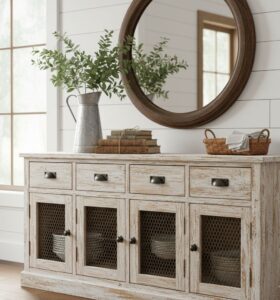 Perfect for the dining area or entryway, a sideboard adds both style and storage. Distressed paint, antique handles, or a sliding barn door feature make it a classic farmhouse staple.