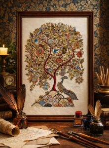 Kalamkari (“pen craft”): Uses bamboo pens and natural dyes to create storytelling scrolls and narrative scenes.