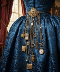 Before modern purses or pockets, chatelaines served both practical and decorative purposes. Worn at the waist and attached by hooks or pins, these ornamental chains held everyday items such as watches, scissors, writing tools, notebooks, keys, or eyeglasses.
