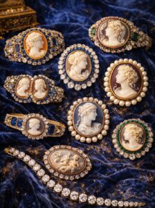 Cameos were widely used in Georgian jewellery and reflected the era’s admiration for classical art. Jewellers carved portraits and mythological scenes from coral, agate, shell, and occasionally lava. Cameos were set into brooches, rings, necklaces, and bracelets, often framed by ornate gold or silver mounts.