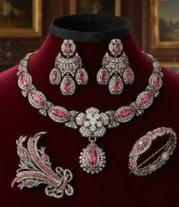 Parures were matching suites of jewellery designed to be worn together. These sets typically included combinations of necklaces, earrings, brooches, bracelets, and sometimes tiaras. Georgian parures often featured convertible elements, allowing pieces to be worn in multiple ways.