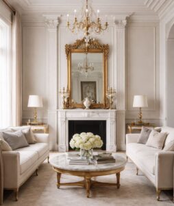 Symmetry is central to Neoclassical interiors, and it’s something you can easily apply without buying new furniture. Arrange seating in pairs, center artwork or mirrors above consoles, and balance both sides of a room visually