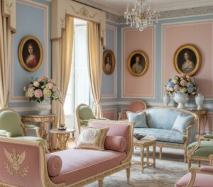 Frames are usually carved wood with restrained detailing. Upholstery tends toward muted tones, often accented with classical patterns.