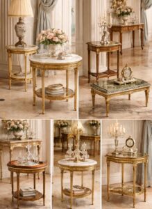 Side tables in the Neoclassical style are functional works of art. Often circular or square, they feature slender legs and minimal ornamentation. Some include marble tops or inlaid surfaces that reference classical geometry. These pieces work well as accent furniture, adding sophistication without visual clutter.