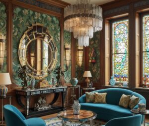 Art Nouveau’s flowing lines, botanical motifs, and handcrafted feel add softness and romance to modern spaces. Think curved wooden chairs, stained glass lamps, and furniture with organic detailing.