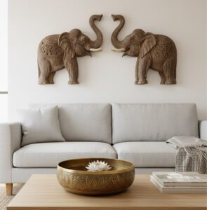 Modern décor use: A carved elephant table or wall hanging anchors any space with calm strength.