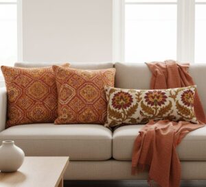 Don’t be afraid to mix patterns, a hallmark of Indian decor. Layer cushion covers with geometric Bandhani patterns alongside throws featuring large Floral Butas.