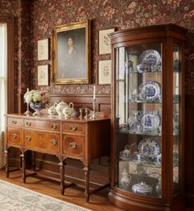 Glass-fronted cabinets were popular for showcasing fine china and collectibles. Sideboards often included: