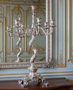 Few pieces capture the drama of Rococo better than tall, twisting candelabras. Their stems curve like vines, and their bases often rest on shell-like feet. Multi-branch candelabras are especially desirable because they highlight symmetry and asymmetry at once. Candlesticks from French makers like Odiot or German courts such as Augsburg are top-tier.