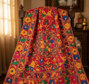 Meaning “flower work,” Phulkari is a beloved embroidery tradition from Punjab. It uses bright silk threads worked in long darning stitches to create bold floral and geometric patterns.