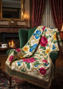 Imagine a silent room. Outside, the seasons change—summer fades to autumn, and the garden sleeps under a blanket of frost. Yet, on a delicately woven shawl, the roses are still looming, the leaves are still green, and the garden is as vibrant as ever.