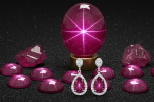 Star rubies display a natural star-shaped pattern, known as asterism, when viewed under light. These cabochon-cut stones are prized for their unique visual effect and rarity.