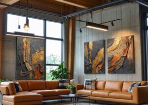 Raw materials such as brick, concrete, and steel are commonly used in industrial spaces. Art that mirrors this rugged quality is often preferred.