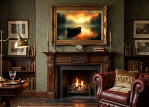 Oil paintings with deep tones or metallic mixed media pieces are often selected.