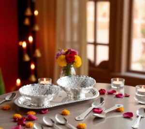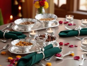 For festivals, adapt silver décor to traditional elements. During Diwali or similar celebrations, pair silver centrepieces with diyas, marigold flowers, or warm-toned candles.