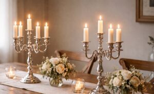 Silver candlesticks range from simple, column-style designs to elaborate multi-arm candelabras. They create warmth and ambience while adding height and structure to table settings.