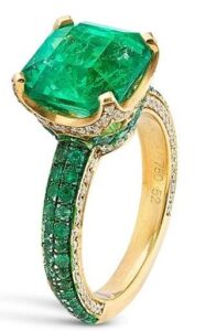 Clean and refined, this 18k yellow gold emerald ring centres on a vibrant Colombian emerald set in an open-sided mount. The band is lined with smaller emeralds, creating a seamless flow around the finger.