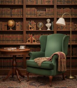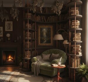 • Furniture: Add a vintage wingback chair or a heavy oak library table. These pieces anchor the room.