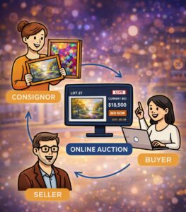 The consignor is the individual or entity selling the artwork. Instead of selling directly, the artwork is entrusted to an auction house.