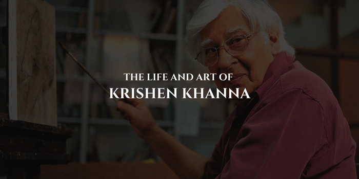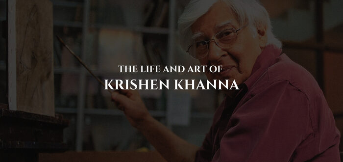 Krishen Khanna was born in 1925 in Faisalabad, Punjab, and grew up in Lahore. His passion for art was ignited when his father bought Leonardo Da Vinci’s Self Portrait and The Last Supper. At the age of 13 in 1938, he moved to England to study art for the first time on a scholarship at the Imperial Service College in Windsor. After graduating in 1942, he moved back to Lahore where he enrolled in the Government College and pursued B. A. honours in English literature. Then came the most important year of his life, in 1946 he started working as an apprentice at Studio One under the painter Sheikh Ahmed and also worked at Kapoor Art Works. He acquired the skill of painting as well as printing while working at both places. With his first income, he bought a painting by Prannath Mago which marked the start of his artistic journey.
