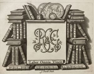 A “bookpile” bookplate is a historical style of bookplate design that was popular in the late 17th and early 18th centuries. The design typically features an artistic illustration of a stack or pile of books, often incorporating the owner’s name or initials within the illustration or on a banner below the pile.