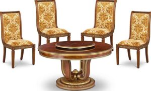 Crafted from red mahogany wood, the round table features intricate gilded detailing and a beautifully integrated Lazy Susan that adds charm and practicality. The accompanying chairs are upholstered in luxurious, patterned fabric, framed by curved mahogany silhouettes that reflect traditional Italian craftsmanship