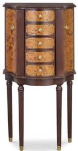 Curved drawers with burr veneer fronts and gilt handles enhance its decorative appeal, while side panels open to provide additional storage for necklaces and brooches. Raised on four tall, fluted legs, the cabinet blends ornamental beauty with everyday practicality.