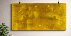 The artwork features translucent layers of ochre and subtle floating forms, reflecting his meditative approach to painting. Gaitonde’s work is known for its quiet intensity, where structure and control exist beneath an apparently free-flowing surface.