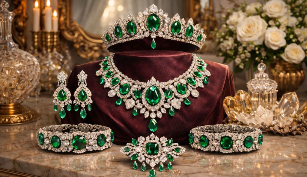 Stacking multiple bangles, oversized cocktail rings, or layered chains on top of a complete suite can disrupt the harmony.